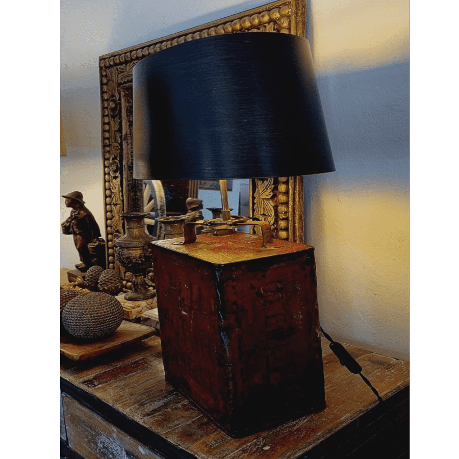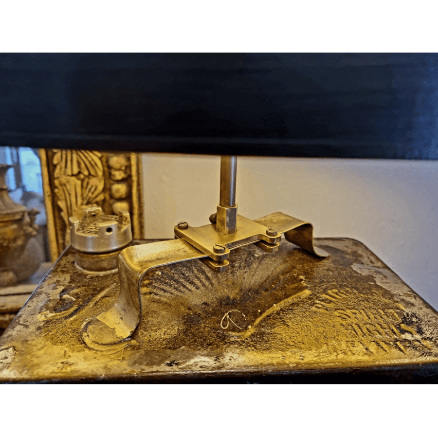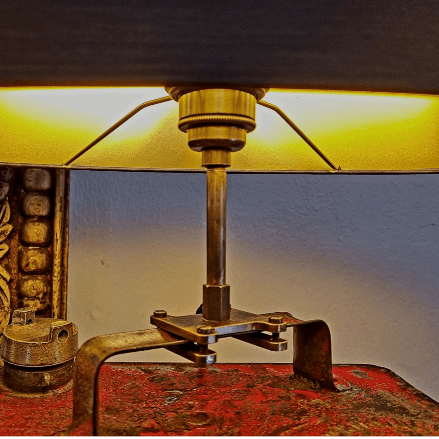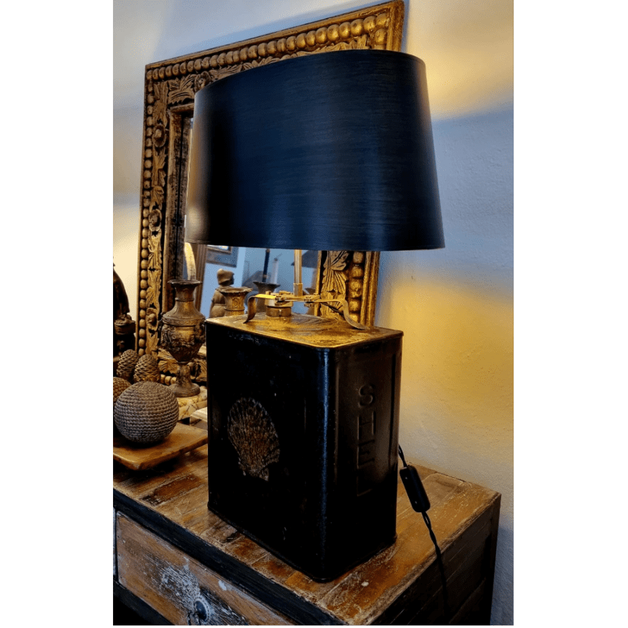 Einzigartige Vintage Tischleuchte gefertigt mit Ölkanne von 1930 Halterung aus massiv Messing gefräst und Lampenschirm Oval Strichlack schwarz mit gold patiniert.